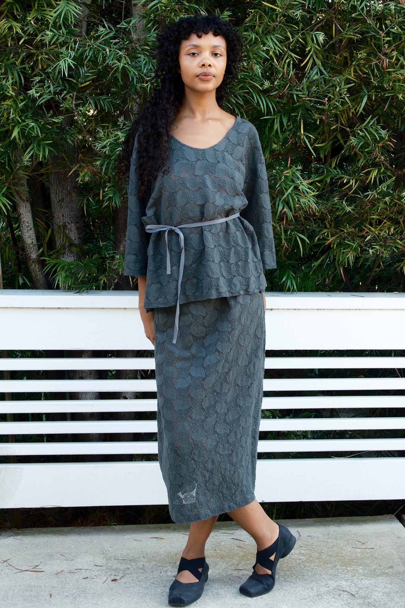 A hip length tee. Features elbow length sleeve with a deep hem to cuff, or not, scoop neckline, deep side slits and a matching twill tape belt.