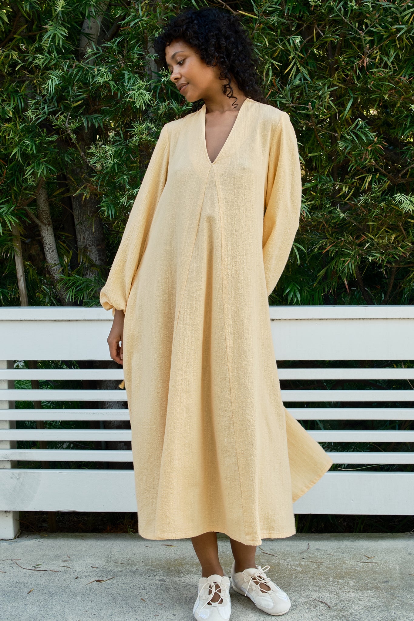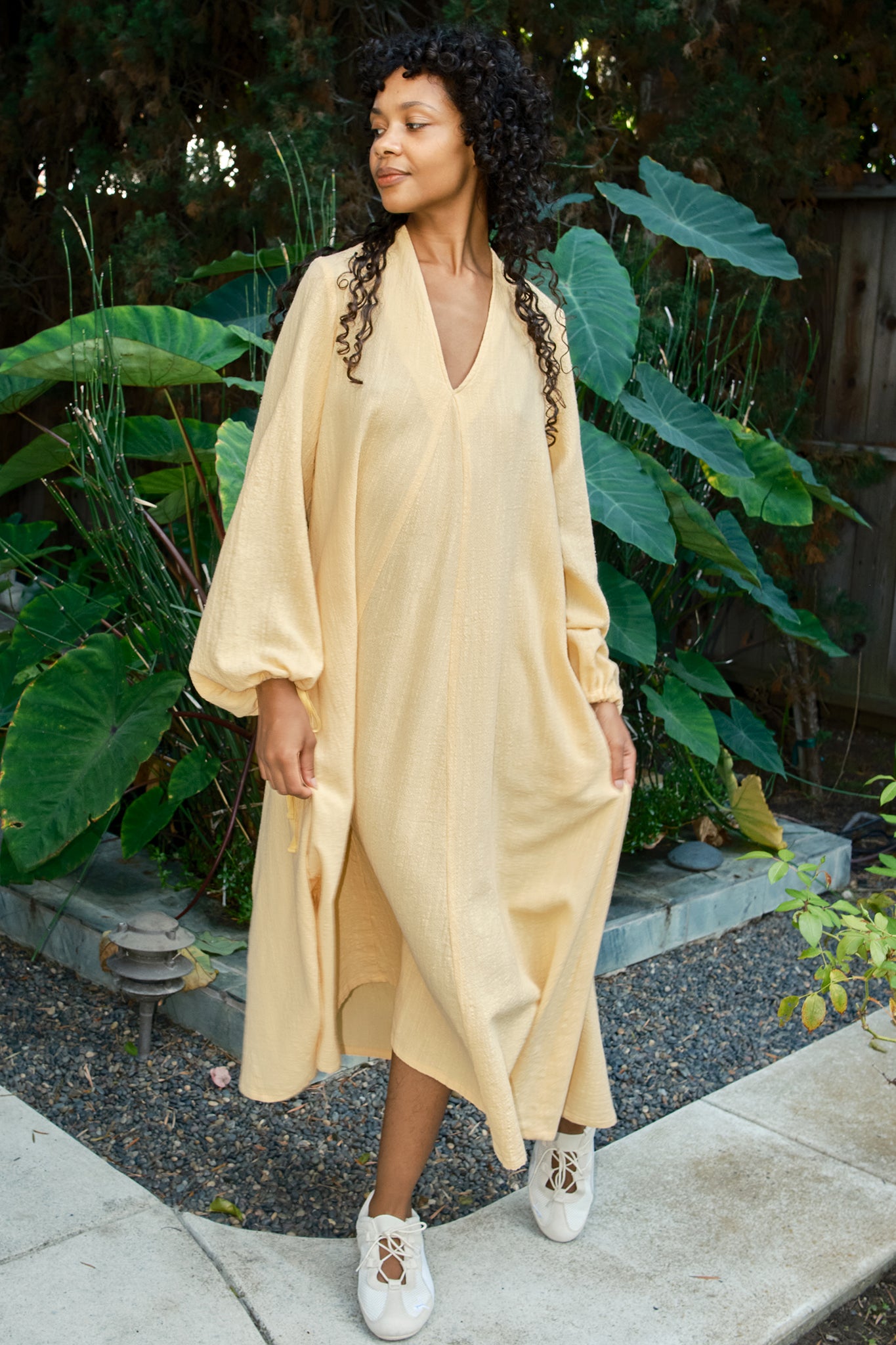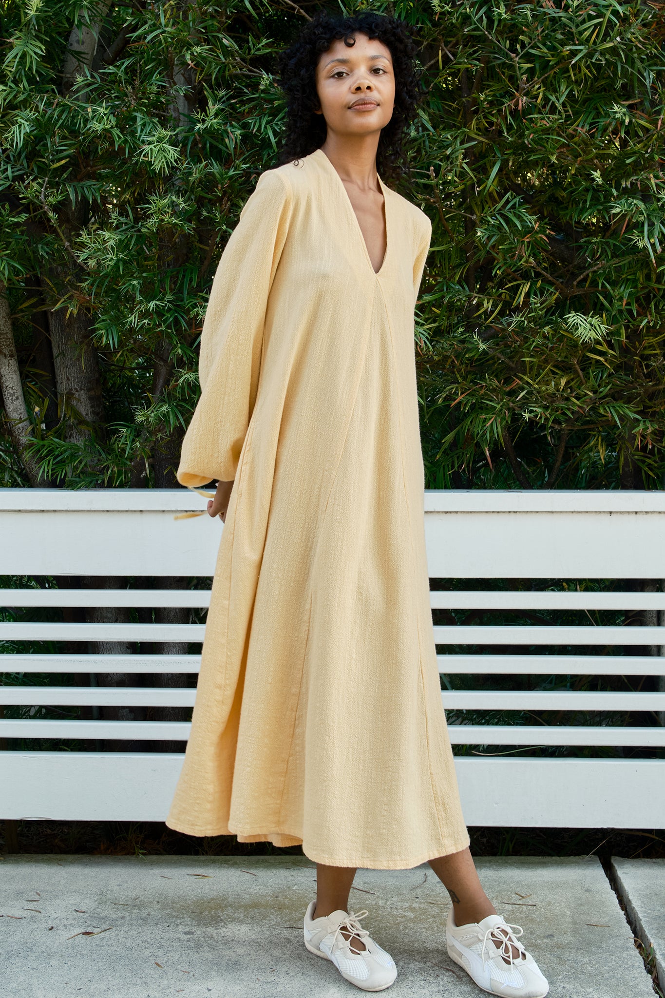 A body skimming caftan dress with a long full sleeves that tie at the wrist. The panels in the dress make the bias fall over the body for a nice drape, side seam pockets