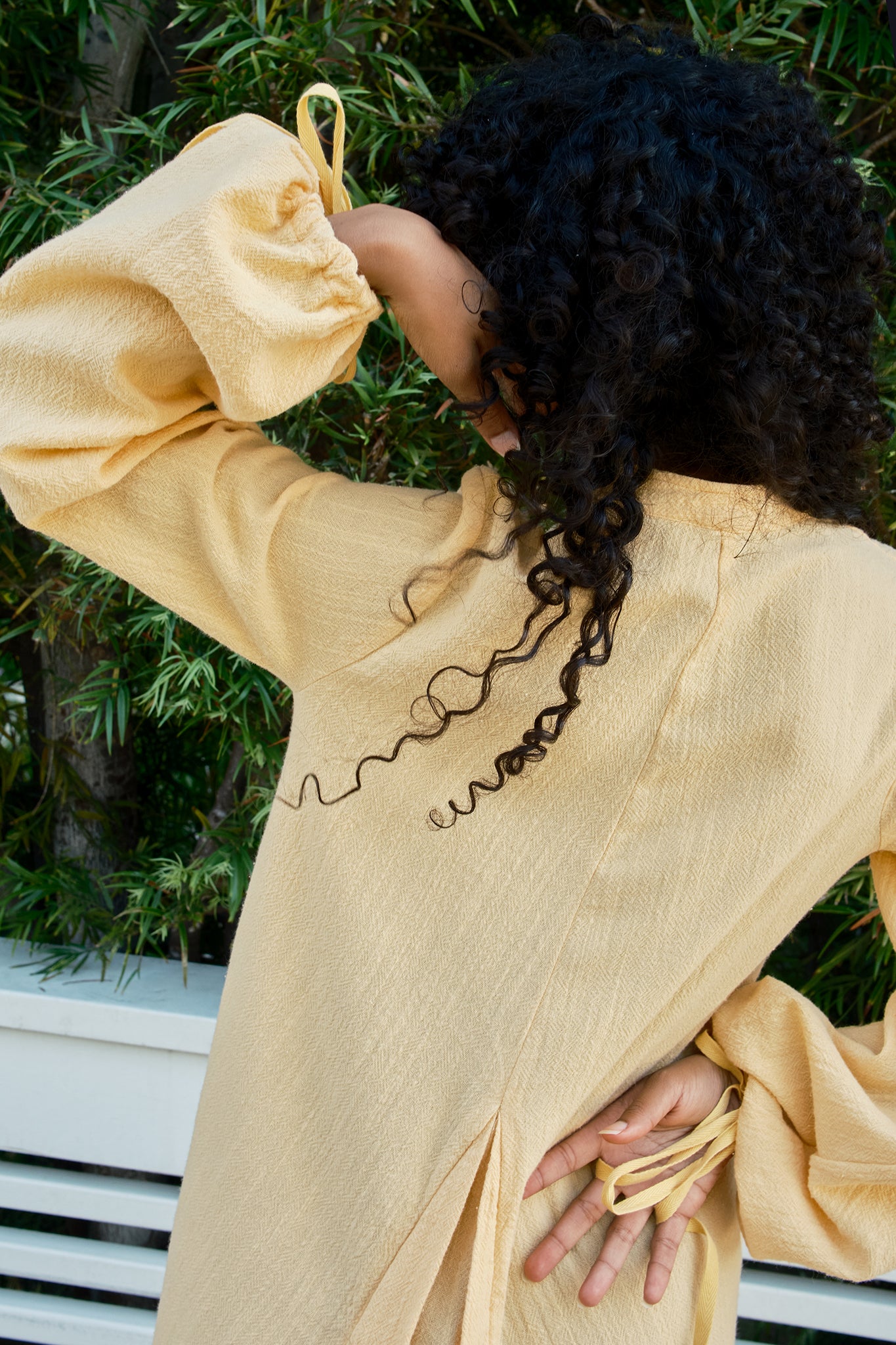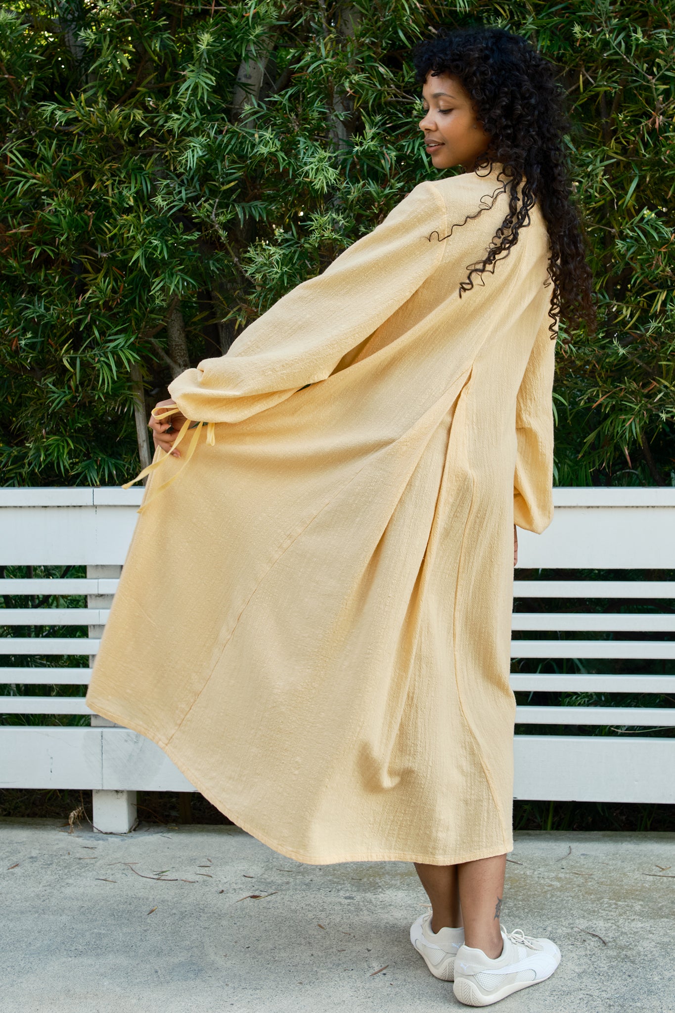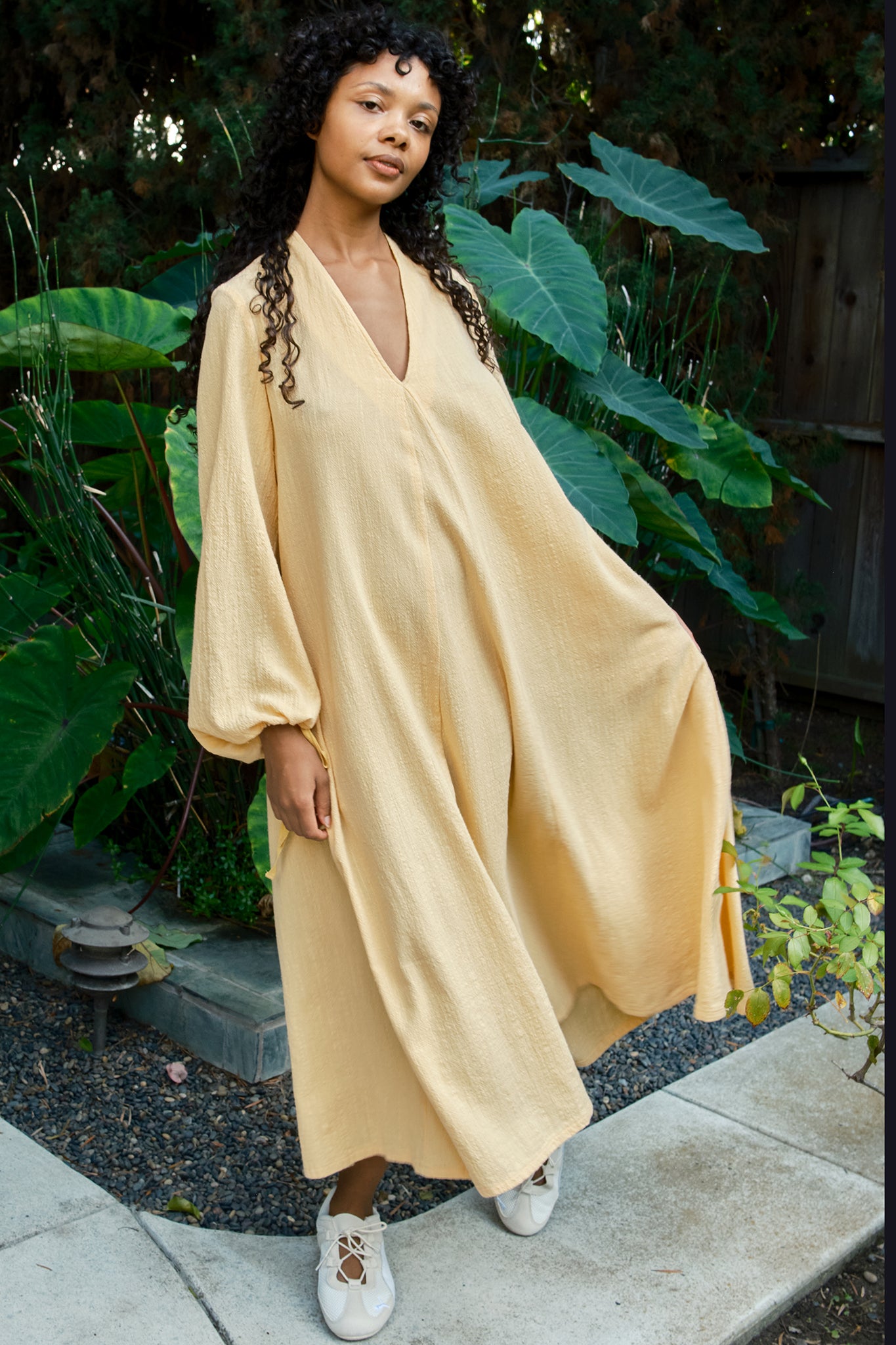 A body skimming caftan dress with a long full sleeves that tie at the wrist. The panels in the dress make the bias fall over the body for a nice drape, side seam pockets