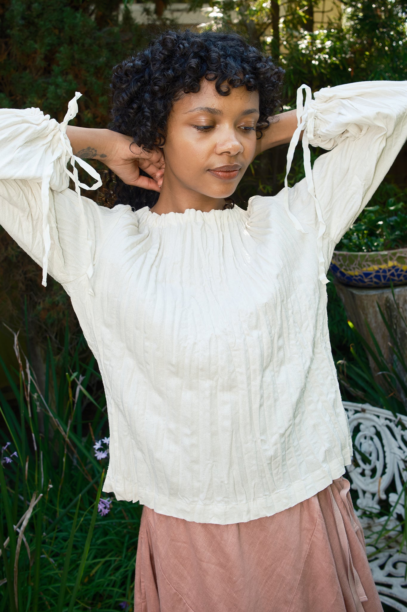 A silk blouse broomstick pleated. Shirring on neckline and balloon sleeves held with Japanese grosgrain ribbon ties. Features a key hole at the back neckline.